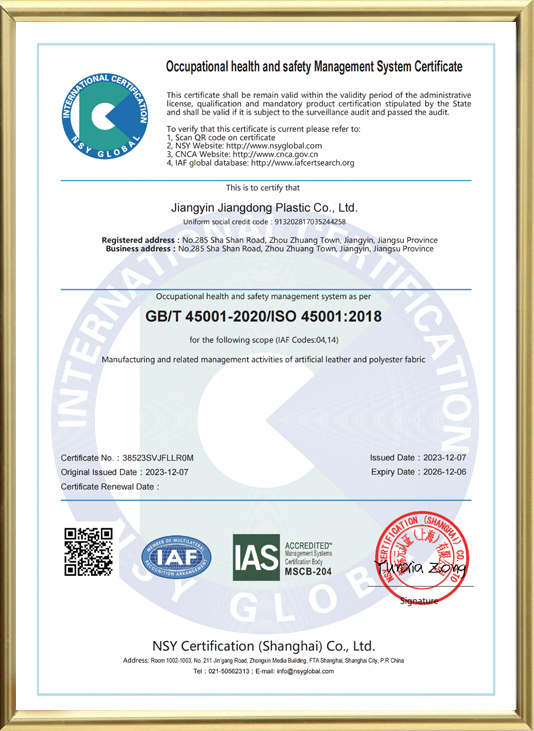 Jiangyin Jiangdong Plastic Co., Ltd. została założona w 1999 roku. Oferujemy Hurtowy Dostawcy skóry tłoczonej z PVC I Chiny Fabryka skór Nappa do wnętrz. Od momentu powstania firma zajmuje się rozwojem, produkcją i sprzedażą sztucznej skóry PVC. Powierzchnia produkcyjna naszej firmy wynosi 35 000 metrów kwadratowych. Obecnie importujemy zaawansowane linie produkcyjne z Niemiec, Japonii i innych krajów, integrując procesy tkania, farbowania i naklejania folii. Wykorzystujemy zaawansowane technologie w produkcji skóry na torby, wszelkiego rodzaju sztucznej skóry (skóry obuwniczej, skóry na sofy, skóry dekoracyjnej, dywaników samochodowych), folii reklamowych itp. Roczna produkcja przekracza 60 milionów metrów. Nasze produkty są eksportowane głównie do Azji Południowo-Wschodniej, na Bliski Wschód, do Republiki Południowej Afryki oraz do innych krajów i regionów.